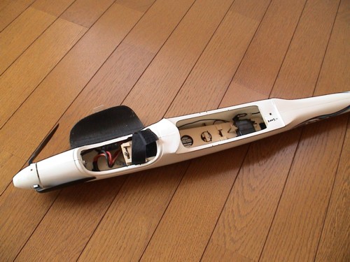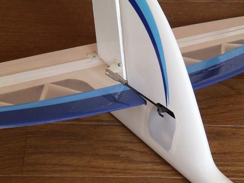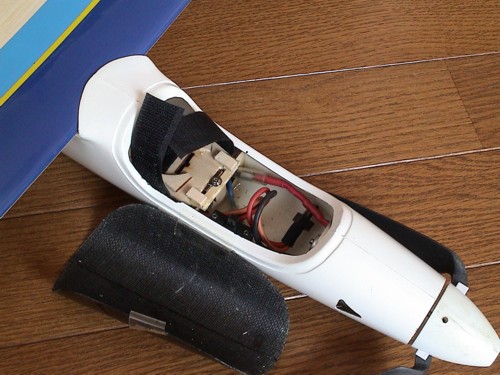機首部が手狭になった理由は、このようにラダーサーボを後に載せる設計の為です。フタバ-S143では重すぎのようです。 |